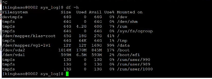 出于排障习惯,习惯性的查询磁盘空间,发现3个节点的剩余可用磁盘空间使用率是100%.处于时间关系,只抓了其中一个备节点的图片。