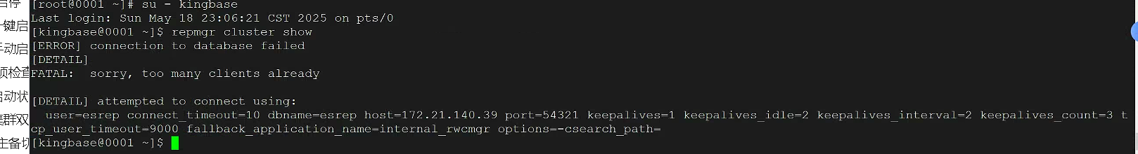 repmgr cluster show查看主节点集群状态,提示超过最大连接数
