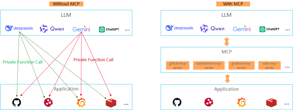 MCP 起源于 2024 年 11 月 25 日 Anthropic 发布的文章:Introducing the Model Context Protocol。MCP (Model Context Protocol,模型上下文协议)定义了应用程序和 AI 模型之间交换上下文信息的方式。这使得开发者能够以一致的方式将各种数据源、工具和功能连接到 AI 模型(一个中间协议层),就像 USB-C 让不同设备能够通过相同的接口连接一样。MCP 的目标是创建一个通用标准,使 AI 应用程序的开发和集成变得更加简单和统一。