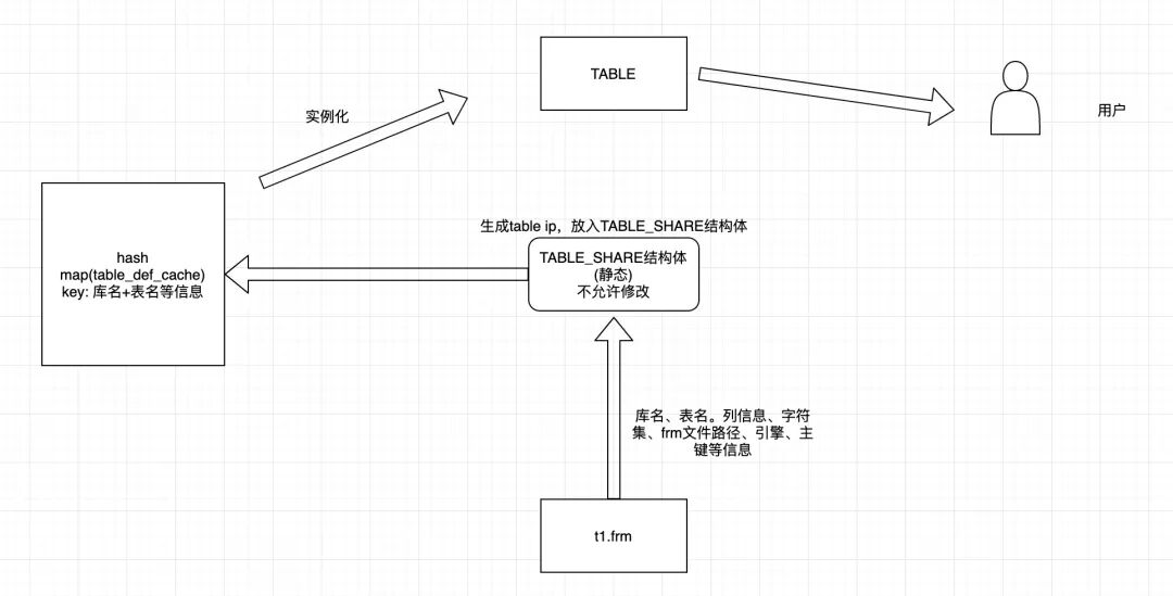 用户查询一个表的数据时,首先会构造根据库名、表名等信息构造hash key,然后从table_def_cache这个hash map中找是否有对应表的缓存,如果存在的话,实例化TABLE_SHARE结构体为TABLE,跟用户交互。如果不存在的话,那么会获取库名、表名等信息存入TABLE_SHARE结构体,在这里生成table_id。