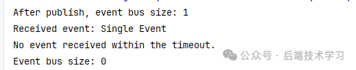 System.out.println("After publish, event bus size: " + eventBus.size());