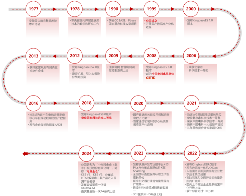 中电科金仓(北京)科技股份有限公司(以下简称“电科金仓”)成立于1999年,是成立最早的拥有自主知识产权的国产数据库企业,电科金仓自成立起始终坚持自主创新,专注数据库领域二十余载,具备出色的数据库产品研发及服务能力,核心产品金仓数据库管理系统KingbaseES(简称“KES”)是面向全行业、全客户关键应用的企业级大型通用数据库。KES产品V9版本已通过国家权威机构认证,产品核心源代码自主率达到100%。