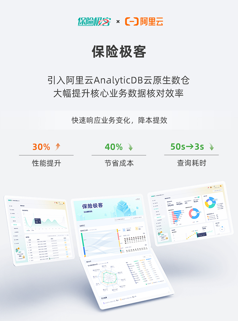 通过引入AnalyticDB,我们在复杂数据查询和实时同步方面取得了显著突破,其分布式、弹性与云计算的优势得以充分体现,帮助企业快速响应业务变化,实现降本增效。AnalyticDB的卓越表现保障了保险极客数据服务的品质和效率。
