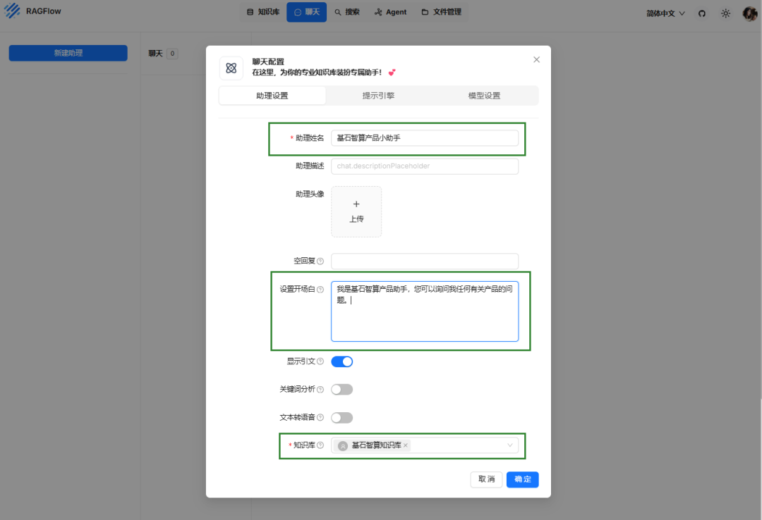 ● 设置开场白:用于设置聊天助理回复问题时的首句话,用户自定义。