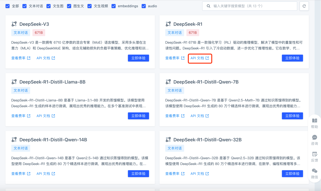 3. 用户可在左侧导航栏选择在线推理服务,点击目标模型卡片页中的 API 文档,查看预置模型 API 服务接口路径,即为模型的 API 域名。