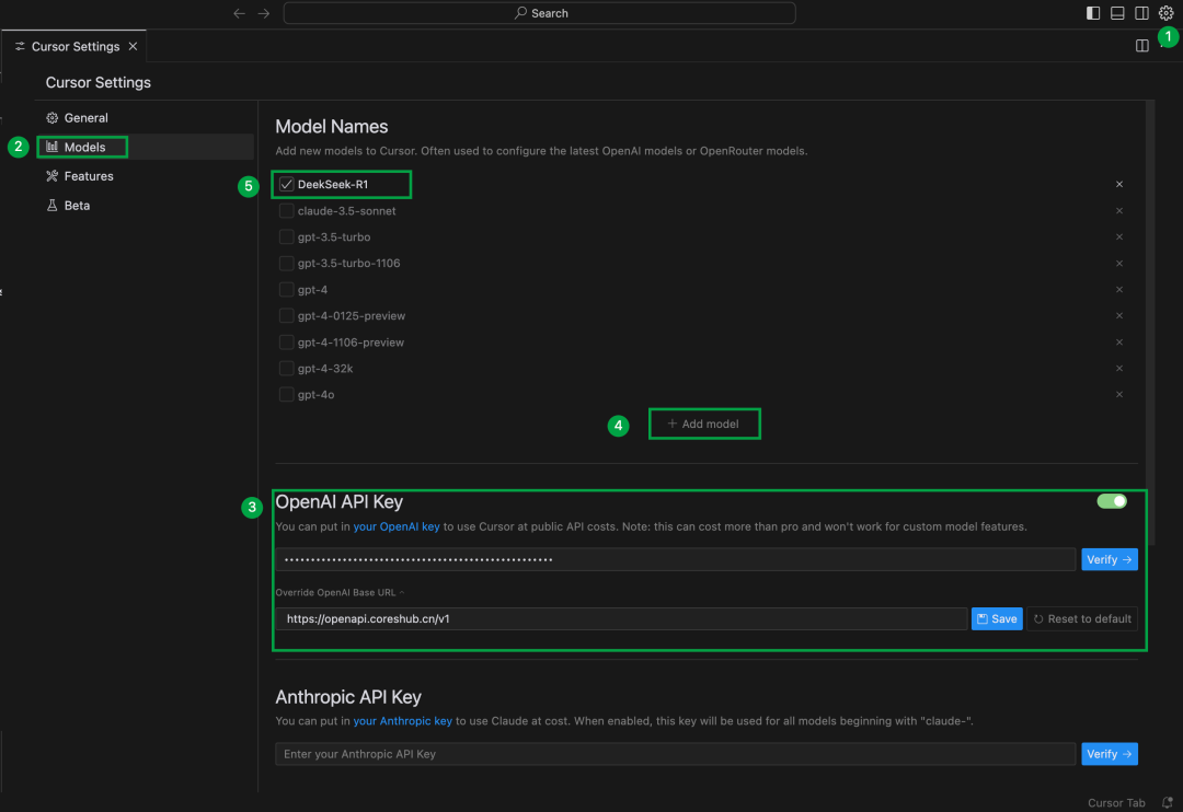 2. 启动并登录 Cursor 客户端,点击右上角的设置图标,选择 Models,配置相应的 OpenAI API Key 和 OpenAI Base URL,点击 Add model,输入模型名称 DeepSeek-R1 并添加,在 Model Name 列表中勾选 DeepSeek-R1 即可。