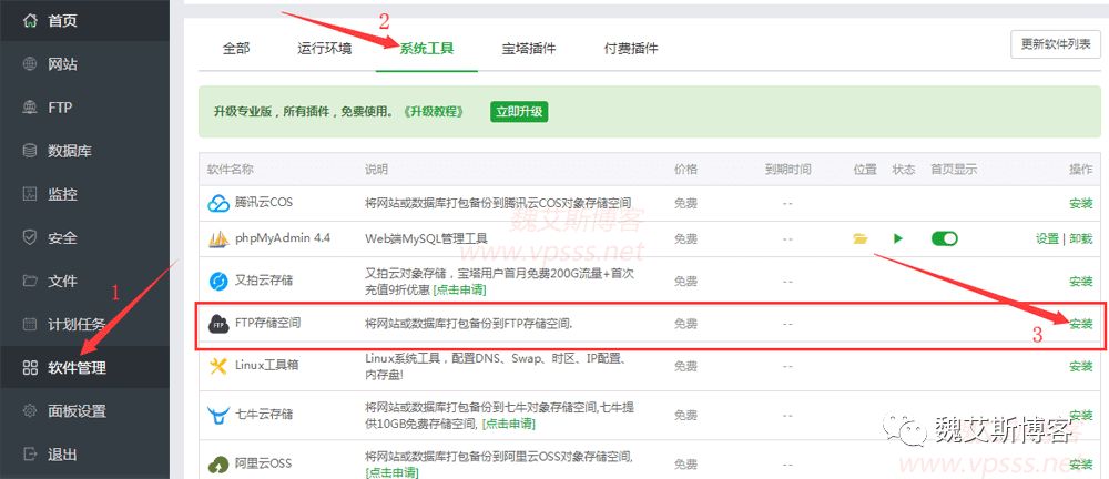 1、这个工具在宝塔面板的软件管理中,在右侧找到“系统工具”,下面看到“FTP存储空间”,点击右侧的“安装”。