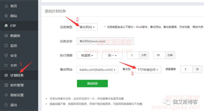 在宝塔面板左侧点击“计划任务”,右侧任务类型选择“备份网站”和“备份数据库”。这是两个计划,需要依次添加。