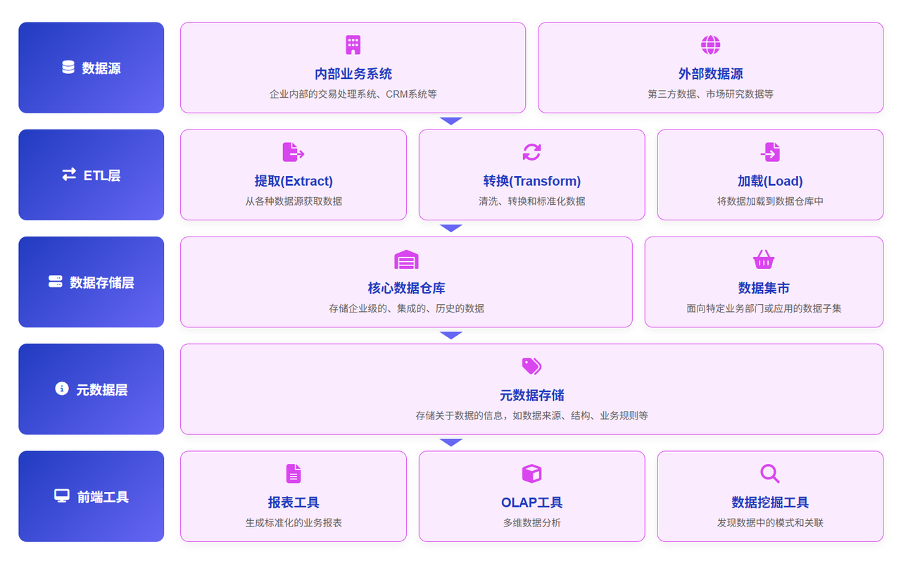 5. 前端工具:包括报表工具、OLAP 工具、数据挖掘工具等,用于数据分析和展示。