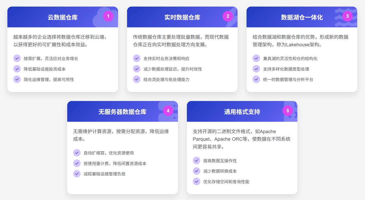 随着技术的发展,数据仓库正在向云端迁移,并与数据湖融合,形成 “数据湖仓一体”架构。这种架构结合了数据仓库的高性能查询和数据湖的灵活性与低成本存储,能够更好地满足企业多样化的数据分析需求。