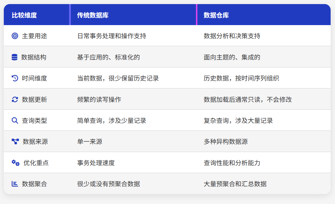 数据仓库和传统数据库在多个维度上存在显著差异: