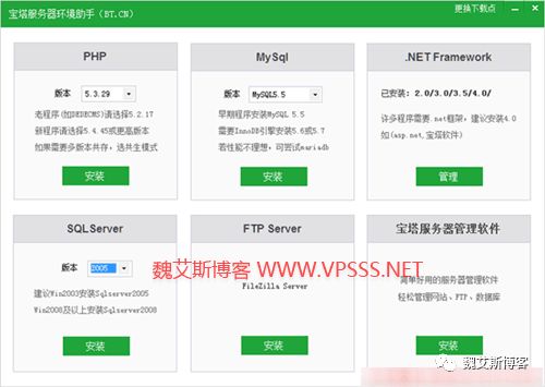 宝塔服务器环境助手的界面如下图,简洁明了,一看就知道安装哪个。因为本博客主要使用 wordpress 程序,所以安装 PHP、MySql,安装版本在程序上面也有提示,一般来说我们就按照提示的去操作就行,不需要安装最新版本的。另外 FTP Server 和宝塔服务器管理软件也是必须安装的,前者是 FTP 的服务器端,后者是新建、编辑网站和数据库用的。