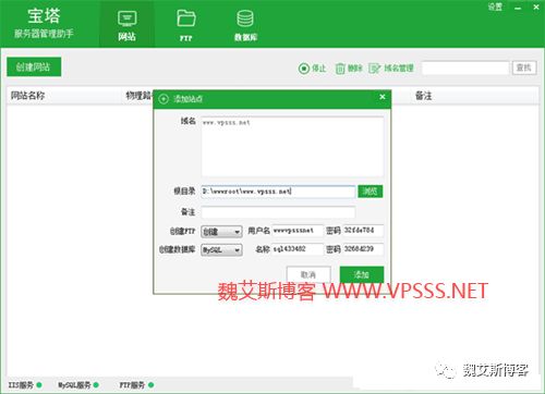 点击创建网站,手动输入域名,也就是你这个网站对外公开的网址。网站根目录是程序自动生成的,选择创建 FTP 和数据库(MySql)后,用户名和密码都是自动生成的,需要记录下 FTP 的账号密码和数据库的账号密码后面使用。
