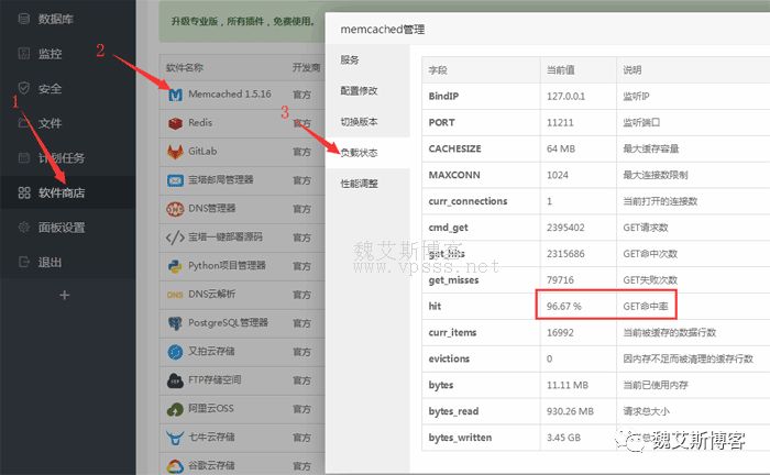 如果你安装 memcached 且正常工作后,随着访问量的增加,memcached 命中率也会不断提高。在宝塔后台 >> 软件商店 >> Memcached (蓝色图标的)>> 负载状态,看到 hit字段的数值就是了,就是 命中率的意思了。老魏截图这个网站经过一段时间的正常运行、用户访问后,能够达到 96.67%左右。