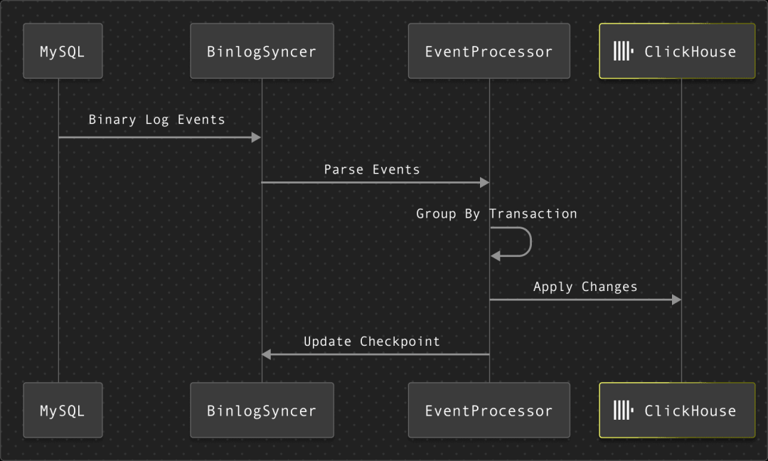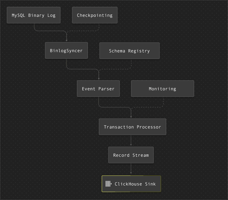 ClickPipes 提供了一套健壮且高效的 MySQL CDC 实现方案,能够稳定捕获并实时同步 MySQL 数据库中的变更内容。系统基于 MySQL 原生的复制能力,结合智能的数据处理流水线,实现了与 ClickHouse 的高效数据集成。