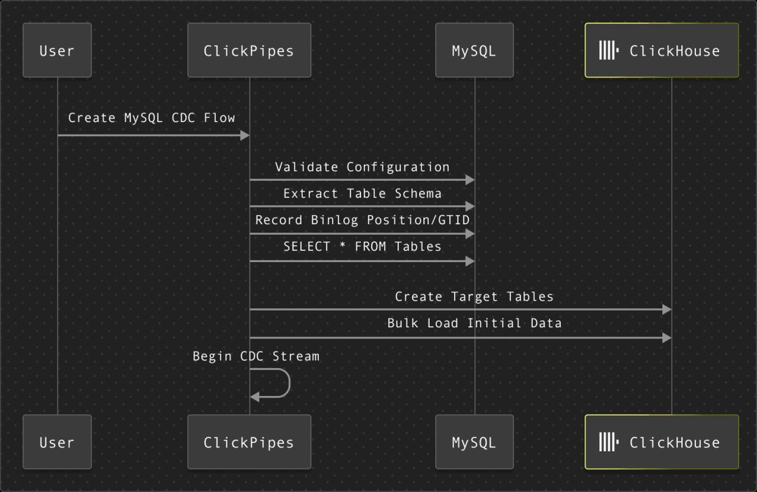 在启动 MySQL 的 CDC 流程时,ClickPipes 会执行一系列初始化操作,包括: