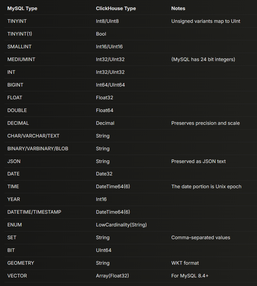 ClickPipes 支持完整的 MySQL 数据类型,并对复杂情况做了额外处理,包括: