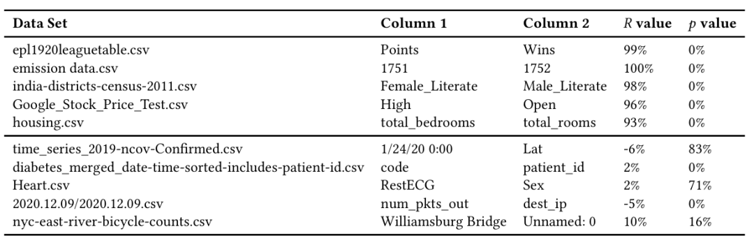 以下实验使用皮尔逊相关系数,如果|R|≥0.9且p值至多为5%,则认为两列相关。在训练时使用80%的数值列对,并报告其余20%列对的结果。