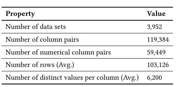 上述表格还总结了与基准数据大小相关的统计信息。该基准总共包含来自约4000个数据集的相关性信息。这些数据集来源广泛,涵盖各种主题。对于这些数据集,该基准包含约12万个列对的相关结果,其中大约一半是数值型(或整型)列对。