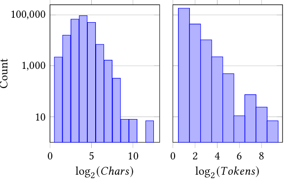 从列名预测可能的相关性的能力可能取决于诸如列名长度等特征。直观地说,较长的列名应该包含更多信息,这可能会使相关性预测更容易。上图总结了根据不同度量标准衡量的列名长度分布。左图展示了字符长度的分布,右图展示了列对中词元(即由空格或下划线分隔的文本片段)数量的分布。
