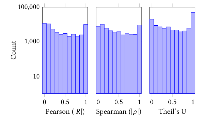 在接下来的实验中,由于会改变判断列是否相关的阈值,因此分析相关性在列对中的分布情况很有意义。相应分布如图所示,从左到右分别显示了根据皮尔逊系数、斯皮尔曼系数和泰尔U系数衡量的相关性。特别是对于皮尔逊系数和斯皮尔曼系数,较低的值比较高的值更常见。对于所有相关性度量,都有一种略微双峰的分布,在最大值和最小值处概率增加。