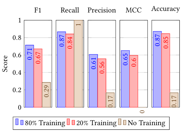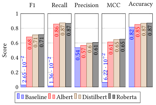 所有三个预训练模型的性能相当相似。在F1分数、精确率、MCC和召回率方面,Roberta表现最佳,因为Roberta是三个模型中最大的。在召回率方面,DistilBERT略有优势。总体而言,在实验中DistilBERT的表现略优于Albert。MCC是三个模型之间差距最大的指标,但总体这三个模型实现了相当的预测性能。总之,假设2得以证明。