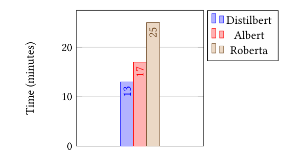 由于AlBERT和DistilBERT的设计目标是与Roberta等较大的模型相比减少开销,结果表明,这种方法在相关性预测任务中也有成效。DistilBERT的训练时间比Roberta少两倍以上。DistilBERT的性能略优于Albert,该模型似乎是减少训练开销的最佳选择。总之,假设3得以证明。