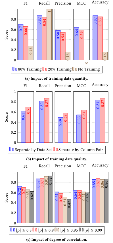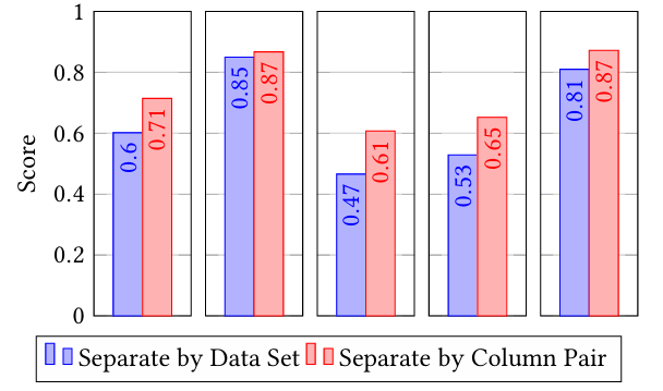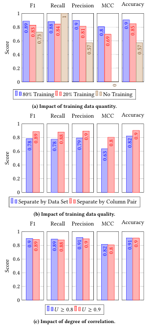 上图比较了不同训练(和测试)比例下的预测性能。比较了两种场景下的性能:第一种场景使用80%的列对作为训练数据,其余用于测试;第二种场景使用20%的列对作为训练数据,其余用于测试;第三种场景不使用任何训练数据(即零样本设置)。实验表明,对于所有五个预测质量指标,更多的训练数据都有助于提高性能。