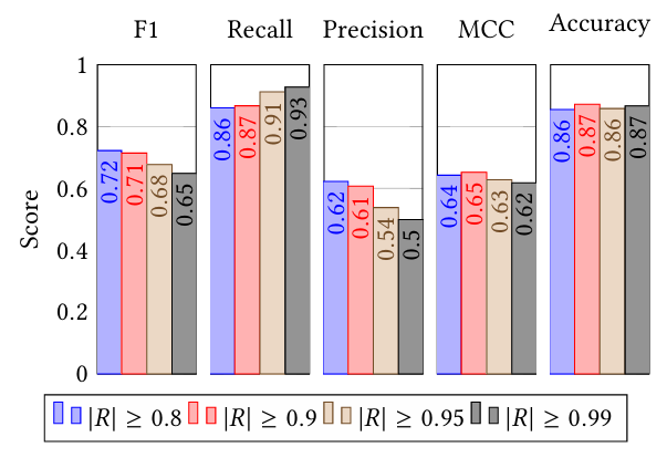 上述假设将定义相关性的标准与预测性能联系起来。以下实验使用5%的p值阈值,但将|R|的阈值在0.8到0.99之间变化。实验结果没有显示出明显的趋势。随着相关性要求变得更严格,召回率通常会增加,而精确率和F1分数会下降。准确率和MCC没有显示出明显的趋势。总之,实验结果没有为假设6提供有力的证据。