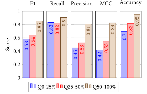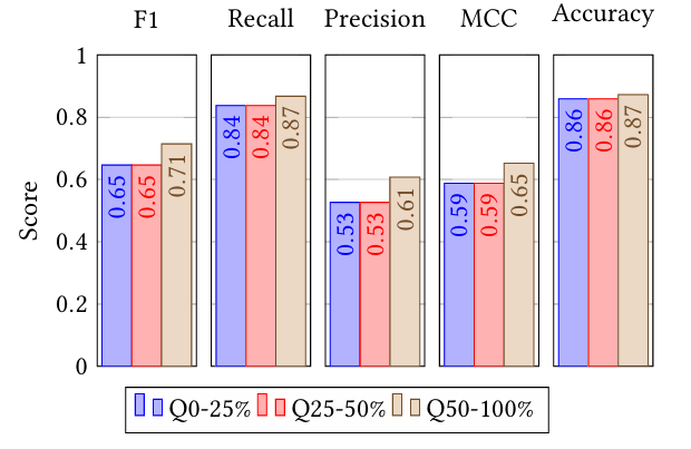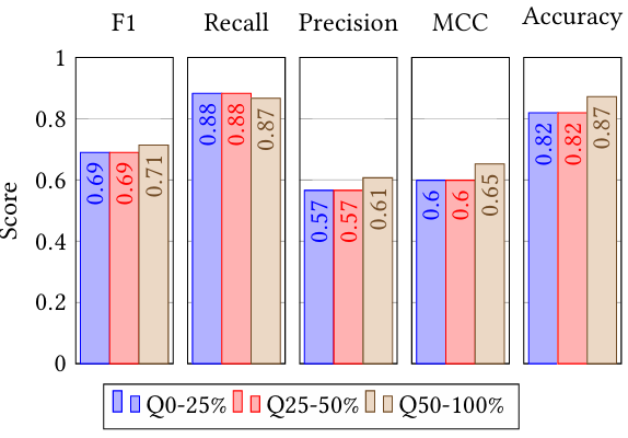 实验表明,低单词比例和高单词比例之间的绝对差异相对较小。例如,MCC分数仅从低比例的60%增加到高比例的65%。总体而言,假设8的实验证据较弱。