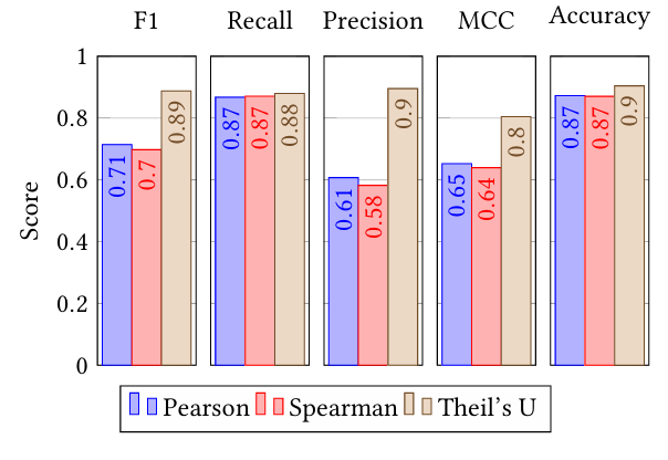 试验结果表明,虽然皮尔逊系数和斯皮尔曼系数的预测性能相近,但根据所有质量指标,泰尔U系数的预测性能有所提高。由于实验中泰尔U系数训练的数据更多,所以对于假设1,更多的训练数据(所有类型的列,而不仅仅是数值列)有助于提高这种性能。