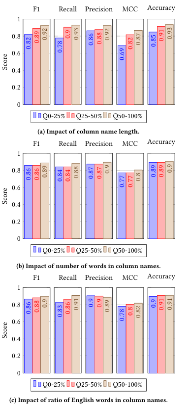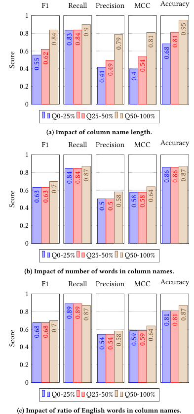 上图报告了根据列名中英文单词比例划分的列对子集的结果。它通过以下方式测量该比例:首先,使用常见的分隔符将两个列名拆分为词元,然后将每个词元与英语词典进行比较,词典中包含的单词数量与所有词元数量的比值即为单词比例。上图将列对分为三组,分别与该比例的不同范围相关联(“Q50-100%”包括英语单词比例等于或高于平均值的列对)。