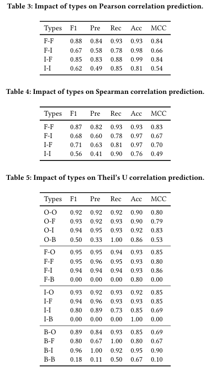 实验根据涉及的列的数据类型对预测结果进行了细分。考虑列类型类型有bool(B)、float64(F)、int64(I)和object(O)。每个表的第一列包含列对的类型(例如,“I-F”表示第一列为int64类型,第二列为float64类型的列对)。实验报告了三种相关性的结果: