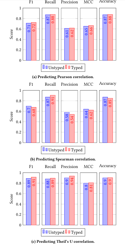 实验表明,在大多数相关性度量和场景中,考虑列类型会带来一定程度的收益。在根据泰尔U系数预测相关性时,使用列类型信息可使精确率提高4%。另一方面,在根据斯皮尔曼相关系数预测相关性时,考虑列类型会导致略微的性能损失。总体而言,这些结果为假设10提供了较弱的证明。