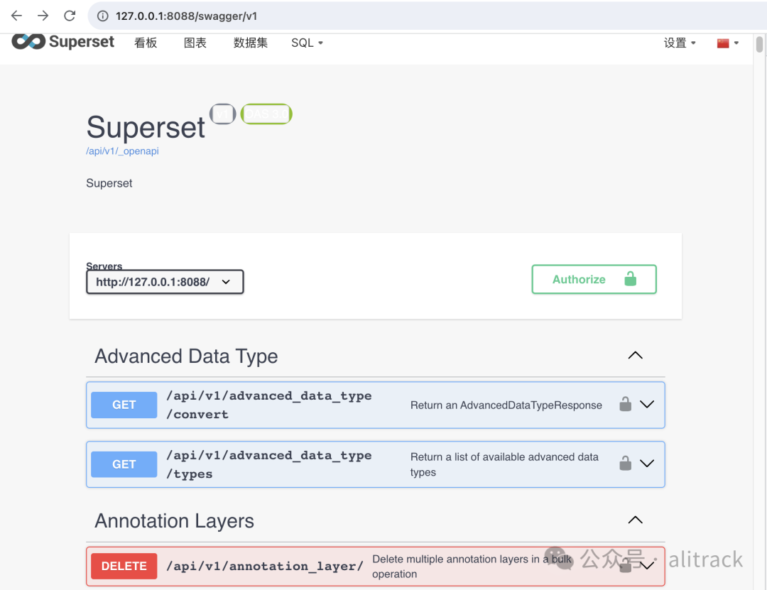另外我们注意到Superset 的公共 REST API 遵循 OpenAPI 规范[1],其文档使用 Swagger React UI[2] 生成。