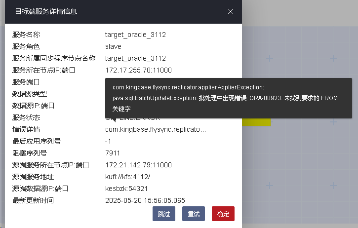 早上对KFS同步链路巡检时发现KES到Oracle这条链路中目标端同步服务离线,KFS管控平台中显示批处理中出现错误: ORA-00923: 未找到要求的 FROM 关键字,以下是分析过程。