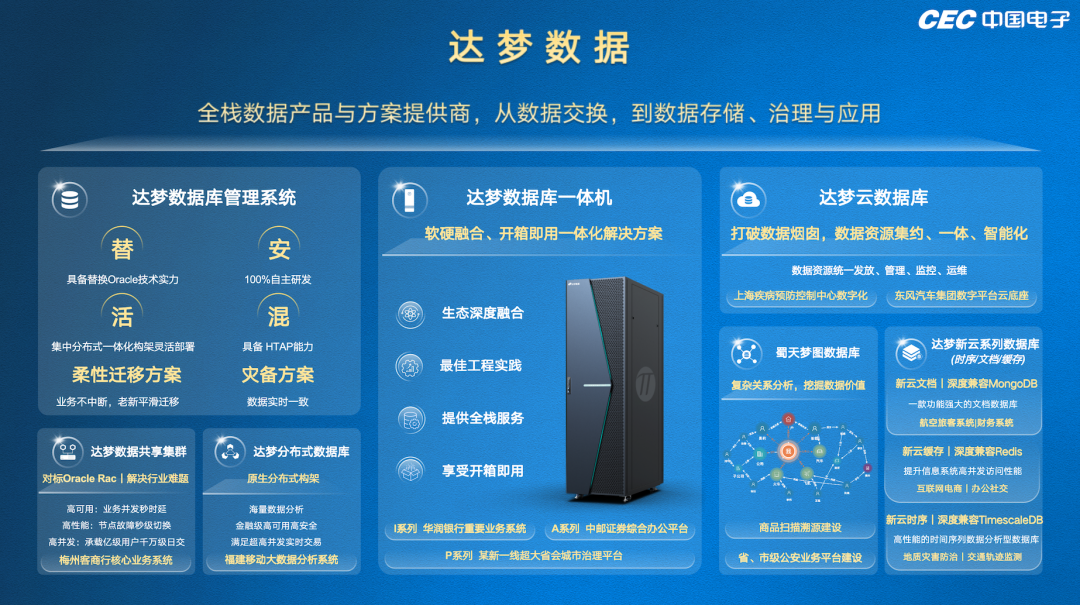 在第八届数字中国建设峰会期间,作为中国电子旗下企业,达梦数据在中国电子展区秀出了其全栈数据产品与解决方案,涵盖数据交换、存储、治理、应用的全流程。