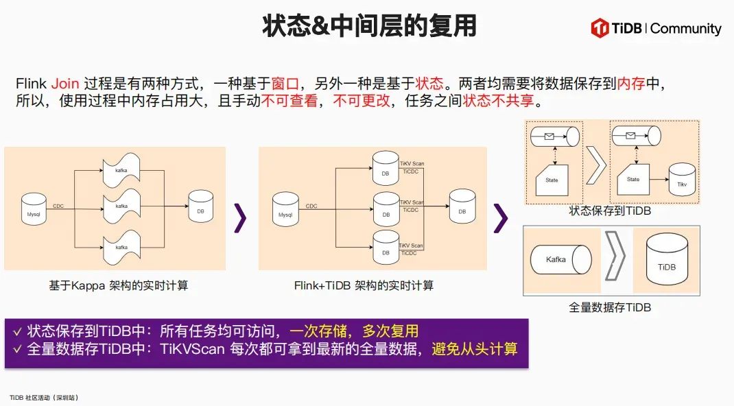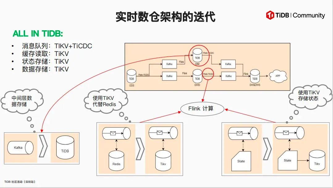 在公司自主搭建的架构方面,与 Kappa 架构相比存在诸多区别。Kappa 架构把中间层数据存储于 Kafka,而该公司架构将数据写入 TiDB。在实时计算的缓存环节,常规做法是用 Redis 快速获取维度相关数据,我们则采用 TiKV 替代 Redis。至于 Flink 的状态存储,将大部分状态数据存于 TiKV,小部分存于 Flink 状态,以此优化内存占用。