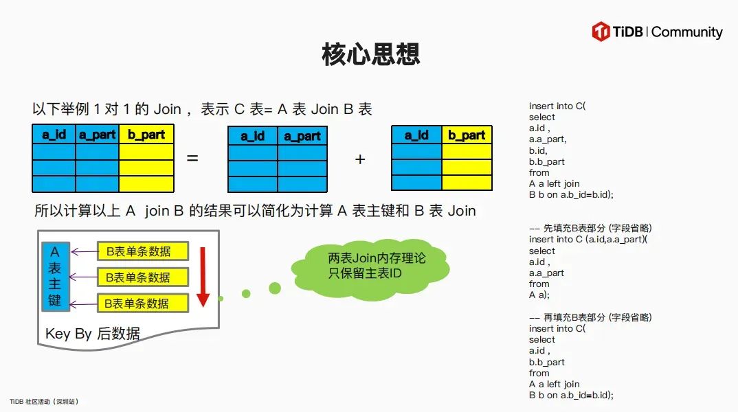 Supply Join 的核心思路在于:在执行 Join 操作时,把整个 Join 流程拆分为两个或多个部分。举例来说,若 C 表是 A 表与 B 表 Join 后的结果,那么可将其拆分为 A 表部分和 B 表部分。具体的操作步骤为,首先把 A 表的数据直接写入 C 表,接着提取 A 表的主键,将其与 B 表进行关联,随后再把关联结果写入目标 C 表,如此便能得到 A 表 Join B 表的最终结果。从理论层面分析,在这一操作过程中,内存仅需保存 A 表的主键 ID,对内存的优化效果极为显著。如果大家对这一过程理解存在困难,这里的 SQL 语句,可辅助理解其中的逻辑关联。