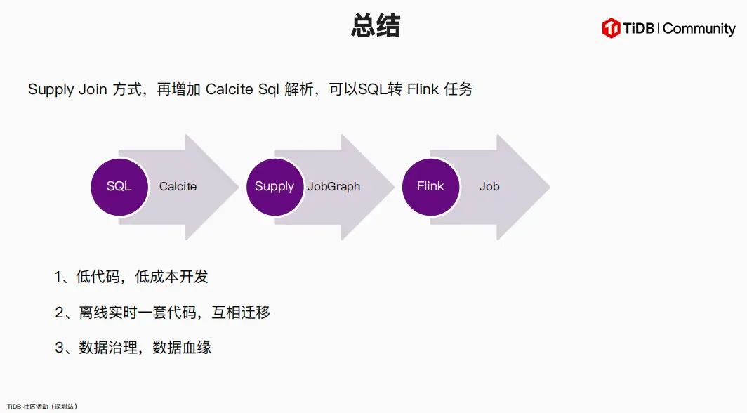 以上便是对 Supply Join 的总结。实际上,整个操作流程可以视为将 SQL 语句转化为 Flink 任务的过程。我们在实际操作中,会运用 Calcite 来解析 SQL 语句,最终实现从 SQL 到 Flink 任务的转换。这种方式具备多个优势:其一,属于低代码开发模式,由于完全基于 SQL 进行开发,极大地降低了开发成本;其二,能够实现实时计算和离线计算使用同一套代码,若后续涉及系统迁移,可直接进行操作,对整体业务的影响较小;其三,有利于数据治理以及数据血缘关系的梳理。目前,Flink 实时计算大多基于代码和 Stream API 进行开发,SQL 的应用占比较少,若能够直接通过编写 SQL 来实现转换,便可以规划出完整的数据血缘关系。
