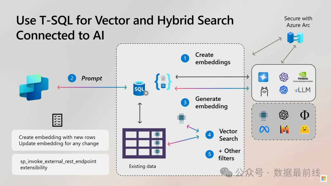 同时创新性地提出模型内嵌架构,允许开发者直接在T-SQL中调用Azure AI Foundry、OpenAI、Ollama等主流模型的REST API,在存储过程中即可嵌入 AI 推理逻辑,大大降低 AI 应用的开发周期和推理延迟。此外,还与 GitHub Copilot 深度集成,能够在VS Code中实现SQL代码自动生成、对象信息检索及查询优化建议等功能。