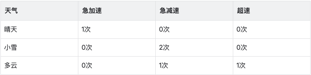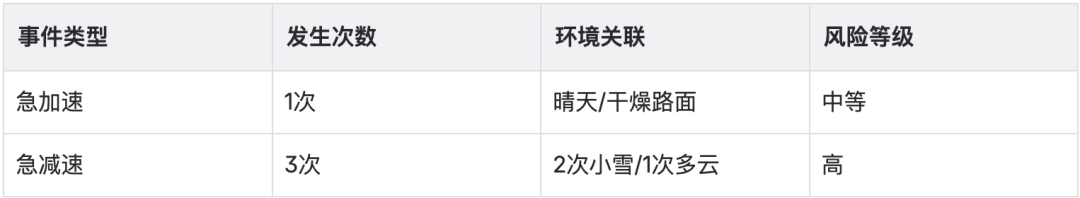关键结论:恶劣天气(小雪)导致制动相关风险事件增加 200%;良好天气时容易出现超速倾向。