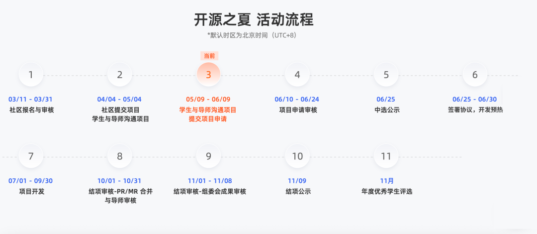 项目申请书提交时间:5月9日 - 6月9日 导师审核阶段:6月10日 - 6月24日 项目开发周期:7月1日 - 9月30日 结项审核与公示:11月9日 年度优秀学生评选:11月