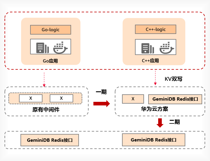 自建数据库X有两套集群,一套集群是X的主备,另一套集群是Codis+X。迁移到GeminiDB Redis接口过程共分两期进行。