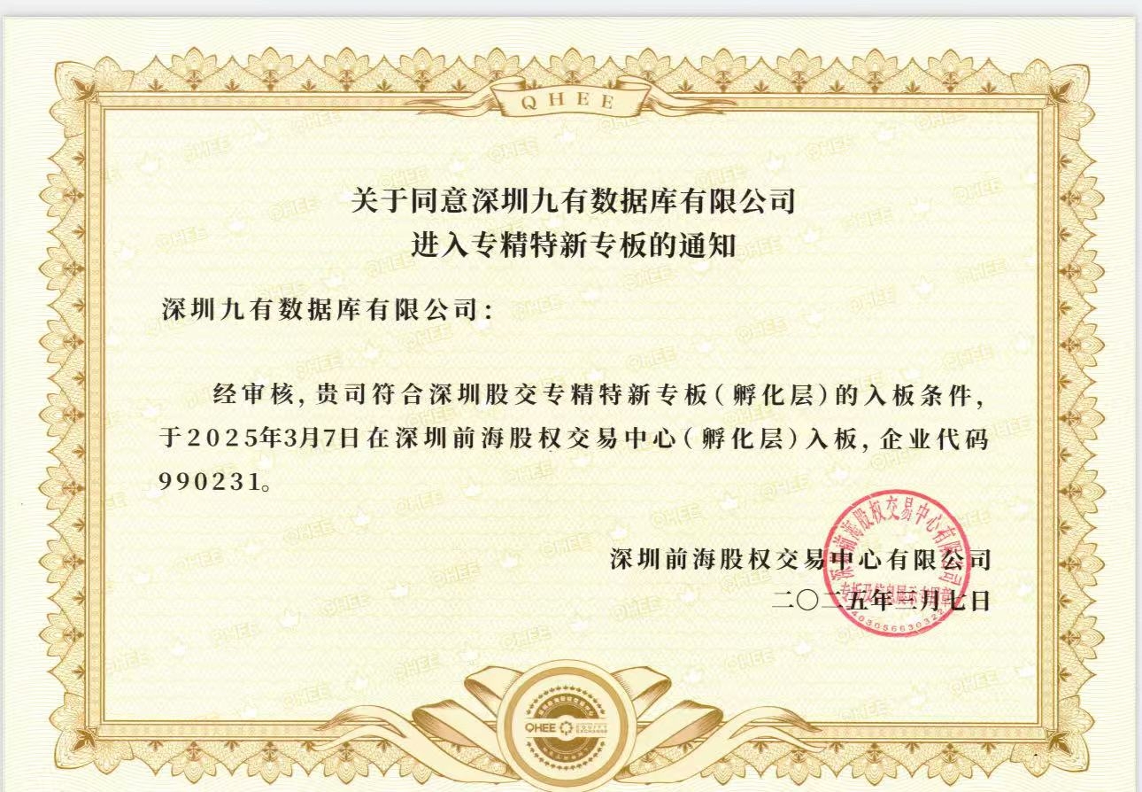 2025年3月7日,深圳九有数据库公司入板深圳“专精特新”专板(孵化层),企业代码990231。
