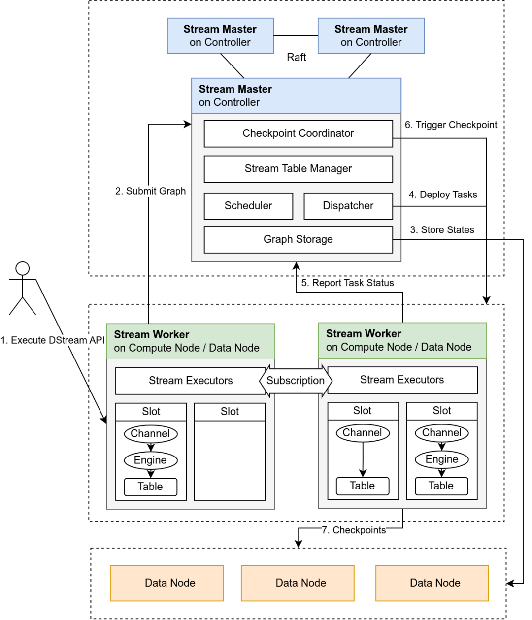 Stream Master:无状态控制中心,负责全局状态管理、任务调度和 Checkpoint 协调。