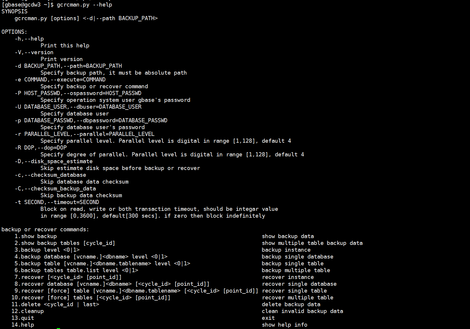 - 执行 gcrcman.py 命令时,必须是安装数据库时指定的 dbauser。