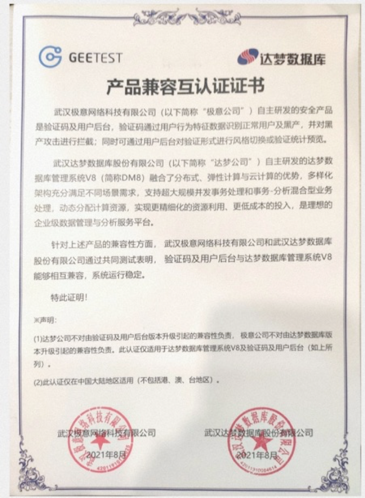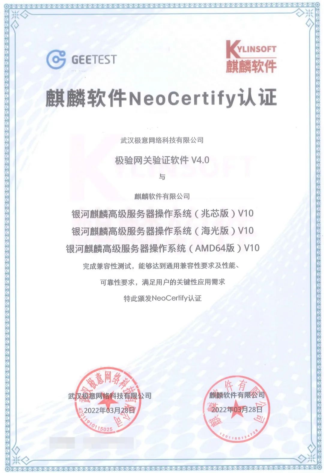 在为各信创企业提供服务的同时,极验也成功获得了多方认证资质,包括麒麟操作系统、达梦数据库、人大金仓数据库等权威认证。除此之外,因为极验已经达到了信创企业对国产软件和操作系统的适配要求,极验还被省软件企业协会、信息技术应用创新工作委员会评为“湖北省信创工委会会员单位”。