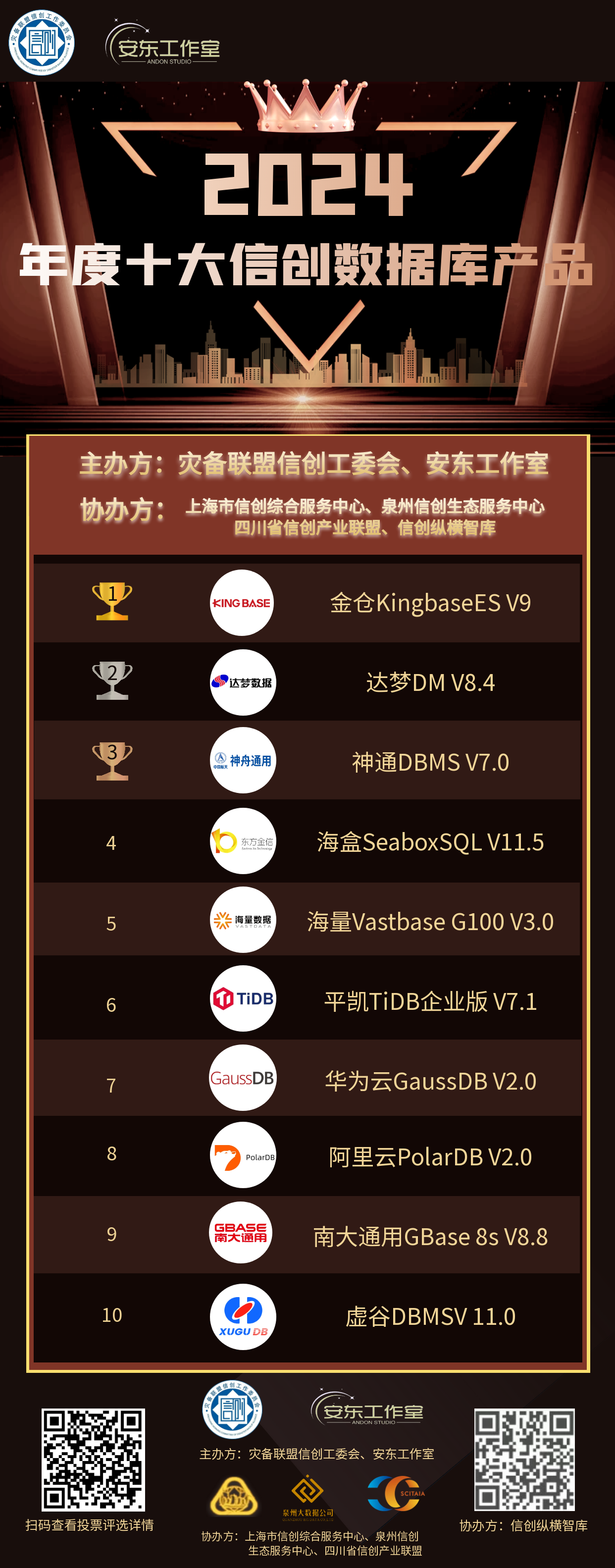 编者按:经过40多天竞争激烈的评选,“2024年度十大信创数据库产品”评选出炉了,详见文内海报!投票结果可扫描海报下方二维码获取。