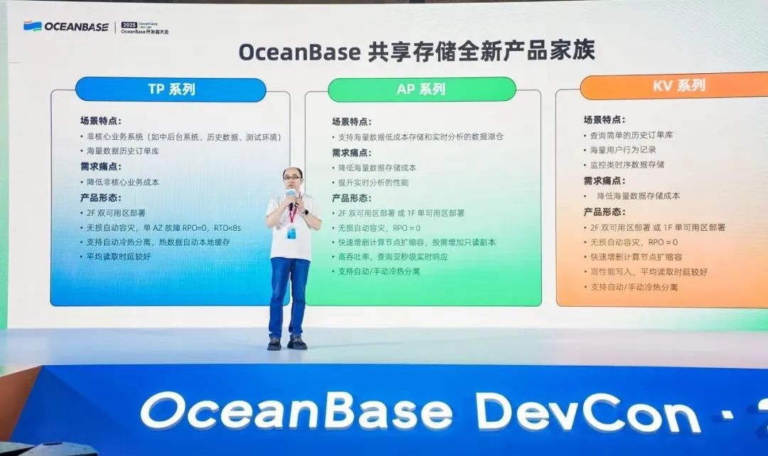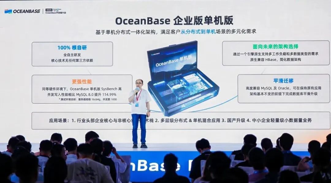 杨志丰现场解读了 OceanBase 在 TP、AP 及云上的关键特性,他强调,OceanBase 致力于通过一体化的产品理念,把OceanBase的技术能力转化成对用户的产品价值。OceanBase 通过一体化架构升级,实现了从单机到分布式的灵活切换、TP 与 AP 场景的深度融合,以及多模能力与向量计算、AI 技术的协同进化,持续将技术能力转化为用户可感知的产品价值。